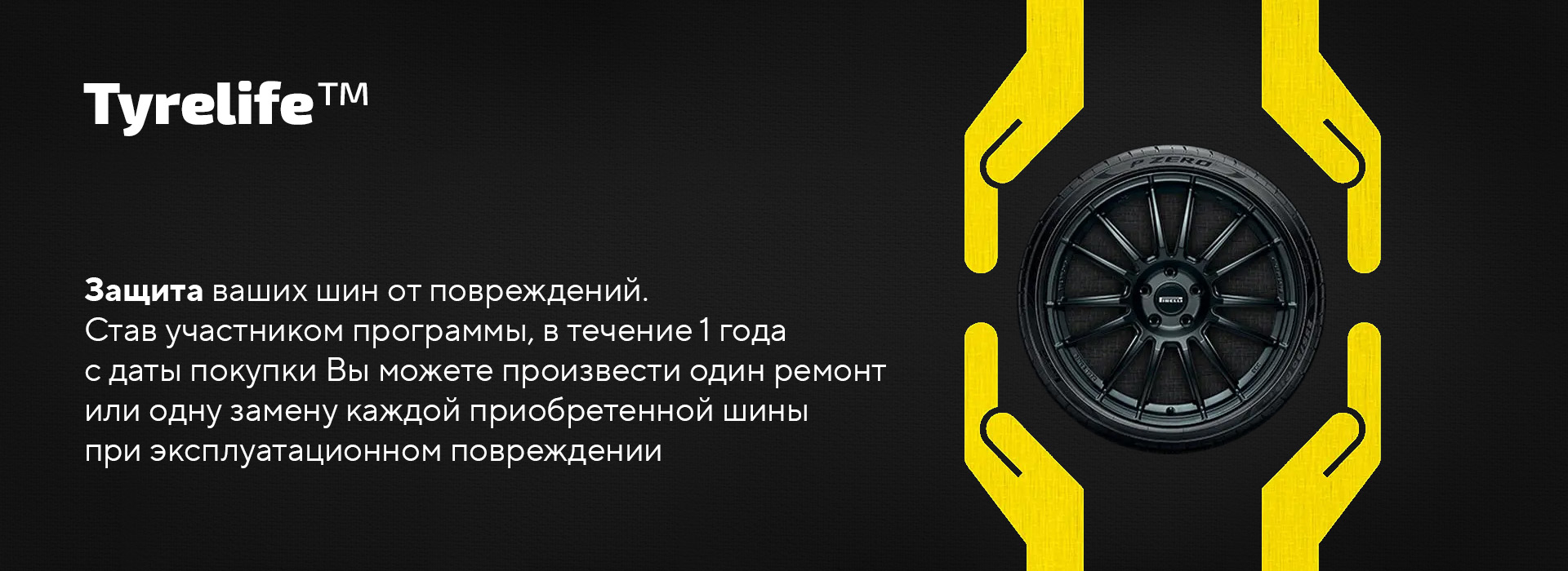 Tyrelife — расширенная программа гарантии на шины торговой марки «Pirelli», является дополнением к стандартным Гарантийным Условиям. Став участником программы Tyrelife, Вы можете произвести ремонт или замену шины при эксплуатационном повреждении: разрыве, порезе, вздутии боковины или проколе. Расширенная программа гарантии включена в стоимость приобретенных шин и предоставляется без дополнительных затрат со стороны покупателя, использующего шины исключительного для личных, семейных, домашних и иных нужд, не связанных с осуществлением предпринимательской деятельности. Гарантия действует при условии, что летние шины имеют остаточную высоту протектора не менее 1,6 мм, а зимние — не менее 4 мм. Кроме того, гарантийная программа Tyrelife распространяется только на шины, которые куплены у официальных дилеров Pirelli. Одним из них является наш интернет-магазин BS-Tyres.ru. На покрышки, приобретенные у третьих лиц или в розничных магазинах, не являющихся дилерами Pirelli, гарантия не предоставляется.